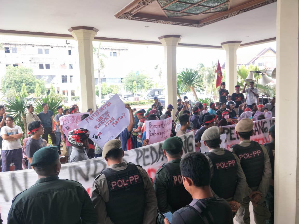 Analiaaaceh.com, LHOKSEUMAWE  | Puluhan pedagang pasar Inpres Lhokseumawe yang menamakan diri Solidaritas Pedagang Bersatu (SPB) bersama Solidaritas Mahasiswa untuk Rakyat (SMuR) menggelar aksi unjuk rasa di depan kantor Wali Kota Lhokseumawe, Senin (16/9/2019).