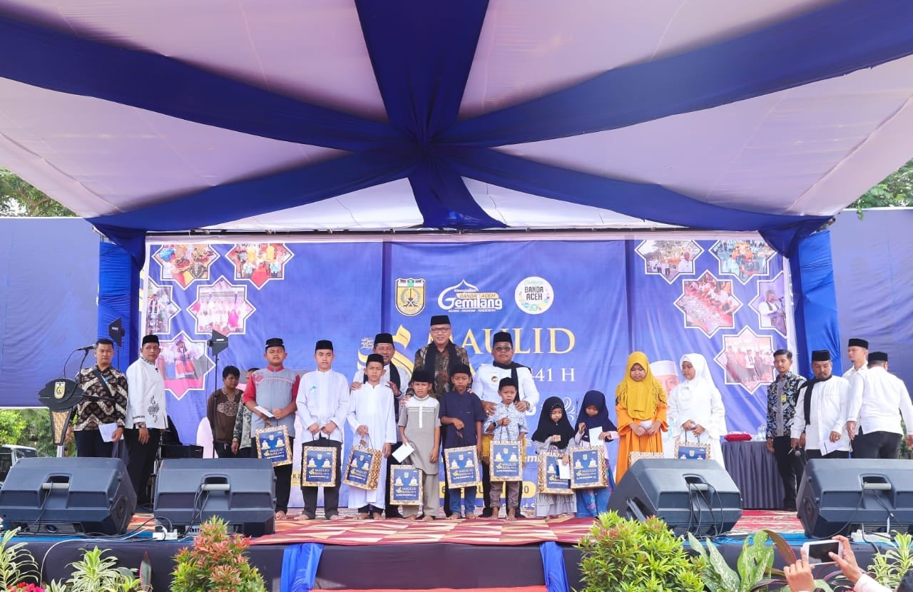 Santunan kepada anak yatim-piatu itu diberikan secara simbolis oleh Wali Kota Banda Aceh Aminullah Usman bersama Wakilnya, Zainal Arifin dan Plt Gubernur Aceh, Nova Iriansyah kepada kepada 10 orang anak di panggung Maulid Raya di Blang Padang.