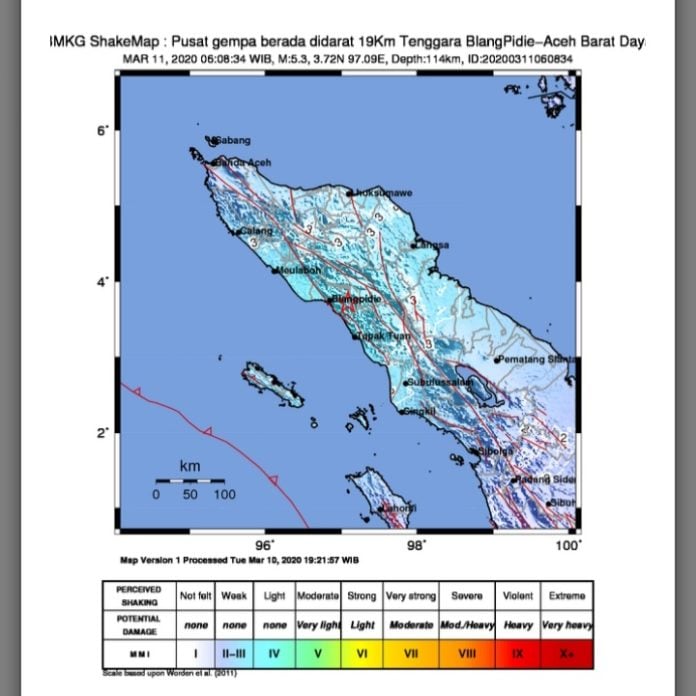 “Pusat gempa berada di darat 19 Km Tenggara Blang Pidie – Aceh Barat Daya”. Demikian tulis BMKG.