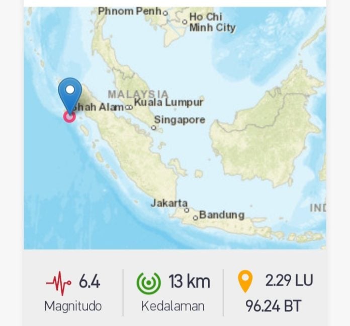 Analisaaceh.com, Simeulue | Gempa bumi dengan magnitudo 6,4 terjadi Kabupaten Simeulue, Provinsi Aceh. Gempa ini tak dilaporkan berpotensi menimbulkan tsunami.
