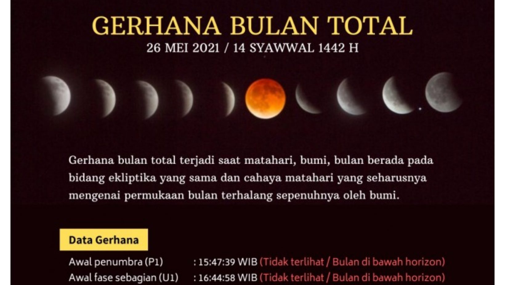 “Berdasarkan informasi dari Tim Falakiyah Kemenag Aceh gerhana ini dapat diamati di seluruh wilayah Indonesia,” kata Iqbal, Selasa (18/5/2021).