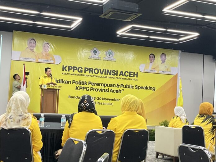 Analisaaceh.com, Banda Aceh | DPD Partai Golkar Aceh melalui Kesatuan Perempuan Partai Golkar (KPPG) menggelar pelatihan Pendidikan Politik Perempuan dan Public Speaking di Hotel Rasamala, Banda Aceh, pada 28–30 November 2025. Kegiatan ini diikuti sekitar 70 peserta dari seluruh kabupaten/kota di Aceh.