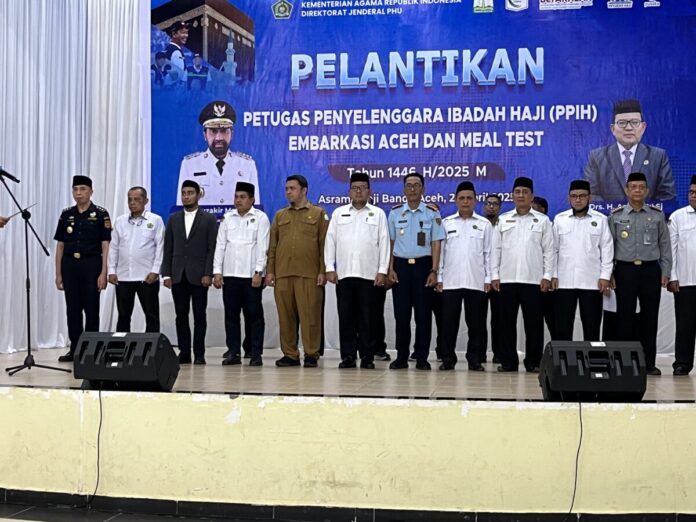 Analisaaceh.com, Banda Aceh | Gubernur Aceh H Muzakir Manaf, di wakili Plt Sekda Aceh M Nasir , atas nama Menteri Agama (Menag) RI melantik Petugas Penyelenggara Ibadah Haji Embarkasi Haji Aceh (PPIH BTJ) 1446H/2025M, di Aula Jeddah UPT Asrama Embarkasi Haji Aceh, Selasa (22 /4/2025).