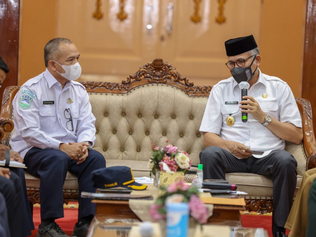 Gubernur Aceh, Nova Iriansyah didampingi Asisten Perekonomian dan Pembangunan Sekda Aceh, Mawardi dan Kepala BPBA, Ilyas, menerima Kunjungan Kepala BMKG Provinsi Aceh, Nasrol Adil beserta jajaran, membahas Pembangunan dan Pengembangan BMKG di Aceh, yang berlangsung di Pendopo Gubernur Aceh, Banda Aceh, Senin (10/5/2021).
