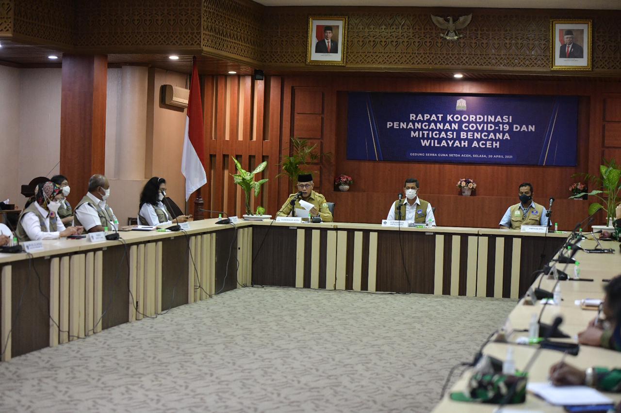 Analisaaceh.com, Banda Aceh | Gubernur Aceh Nova Iriansyah bersama Kepala Badan Nasional Penanggulangan Bencana (BNPB) Letjen Doni Monardo memimpin Rapat Koordinasi Penanganan Covid-19 dan Mitigasi Bencana di Aceh, Selasa (20/4/2021).