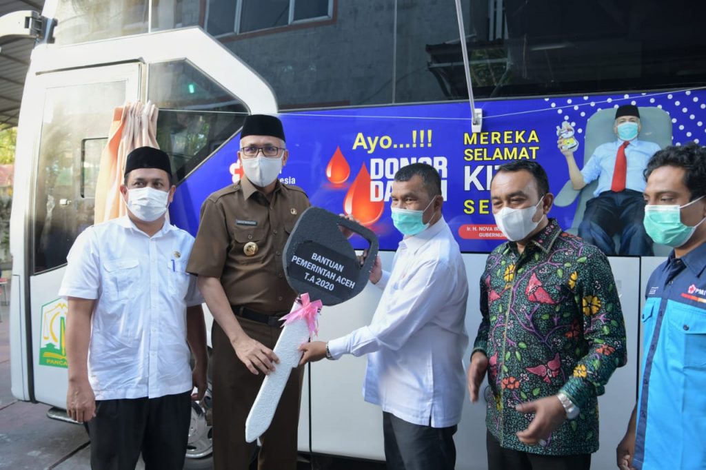 Gubernur Aceh, Nova Iriansyah, didampingi Kepala Dinas Kesehatan Aceh, Hanif, menyerahkan satu unit mobil donor darah untuk PMI Kota Banda Aceh, yang diterima langsung oleh Ketua PMI Kota Banda Aceh, Qamaruzzaman Haqni di Halaman Kantor PMI Banda Aceh, Rabu (28/4/2021).