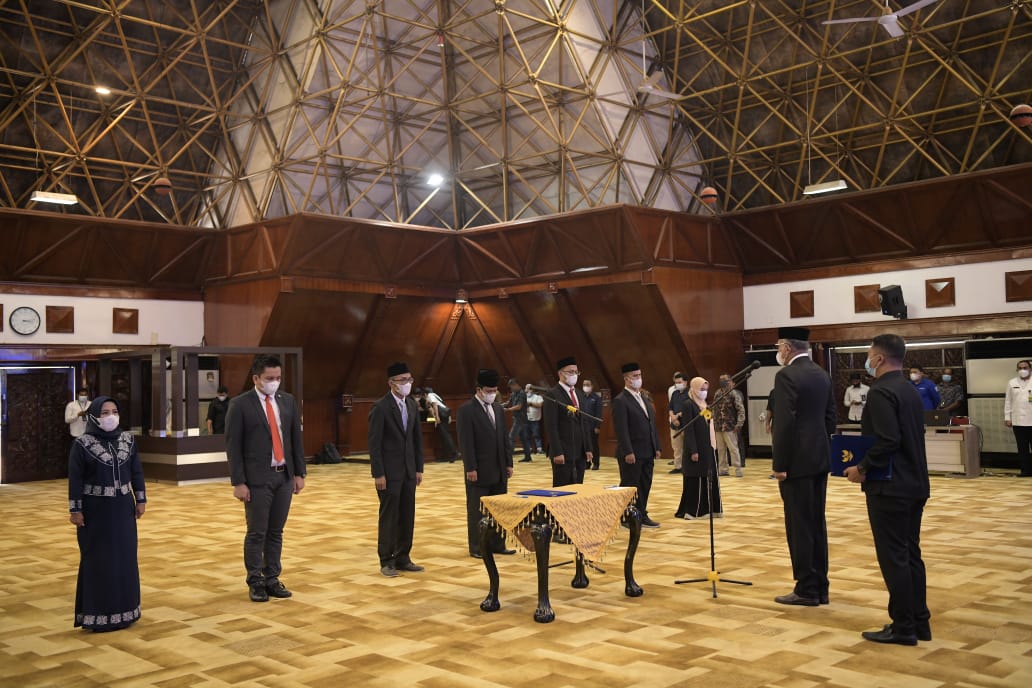 Acara pelantikan itu berlangsung dengan menerapkan protokol kesehatan. Memakai masker dan faceshield, serta menjaga jarak.