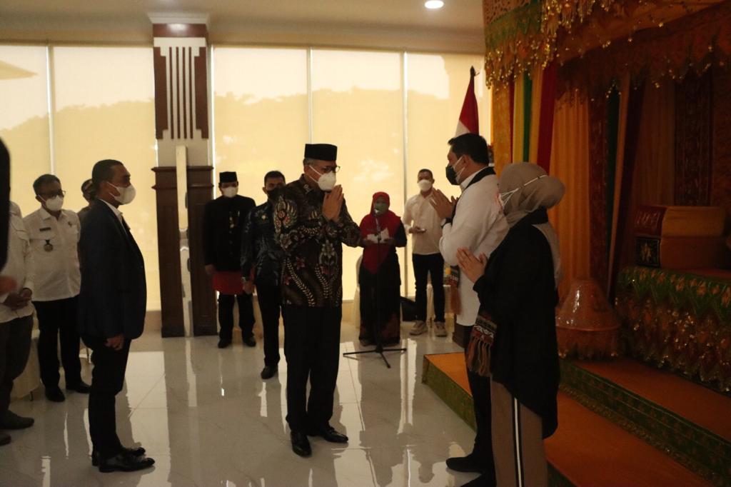 Gubernur Aceh, Ir. Nova Iriansyah, MT bersama unsur Forkopimda Aceh lainnya, menyambut kedatangan Kapolda Aceh yang baru, Irjen Pol Ahmad Haydar, SH, MM, di ruang VIP Bandara Internasional Sultan Iskandar Muda Blang Bintang, Aceh Besar, Kamis (12/8/2021)