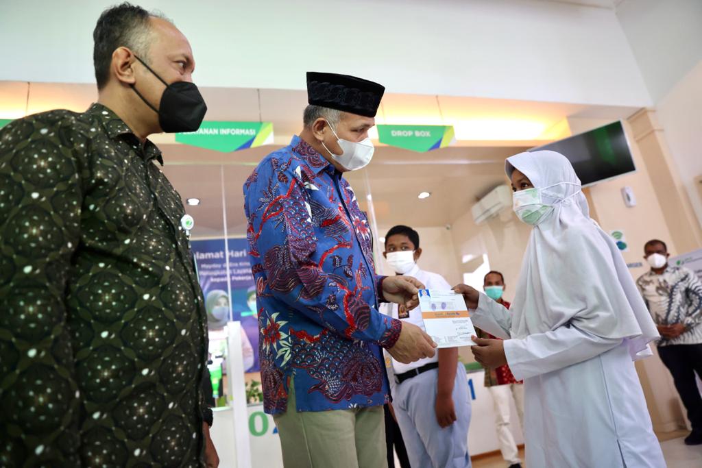 Gubernur Aceh, Nova Iriansyah didampingi Kepala BPJS Ketenagakerjaan Kantor Cabang Banda Aceh, Awalul Rizal, menyerahkan beasiswa sampai ke perguruan tinggi kepada ahli waris peserta BPJS Ketenagakerjaan, di Kantor BPJS Ketenagakerjaan Kantor Cabang Banda Aceh, Sabtu (1/5/2021)