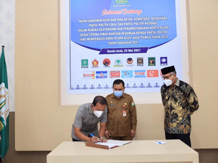 Penandatanganan berita serah terima itu dilakukan bersama oleh semua parpol dan disaksikan langsung oleh Gubernur Aceh Nova Iriansyah, di Aula Kesbangpol Aceh, Selasa (25/05/2021).