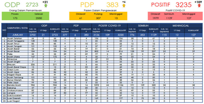 Analisaaceh.com, Banda Aceh | Kasus Covid-19 provinsi Aceh kembali bertambah 109 dan meninggal 12 orang, Kamis (17/9/2020).