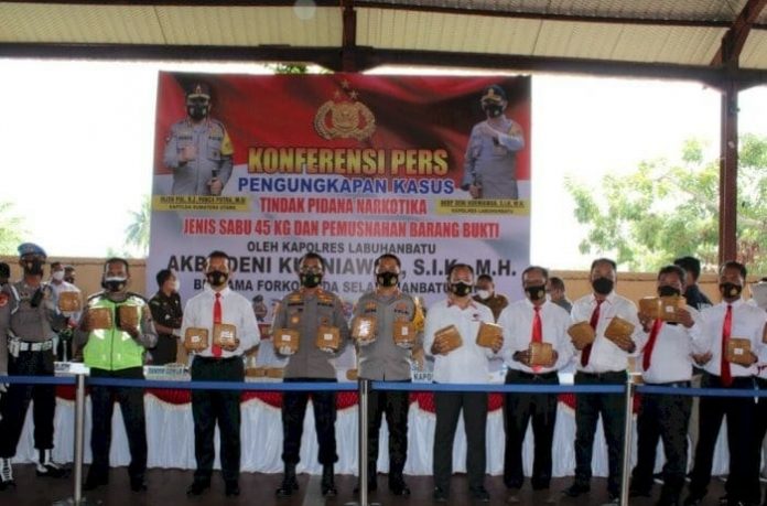 Kapolres menyebutkan bahwa dengan diamankannya 45 kg sabu dapat menyelamatkan 45 ribu jiwa jika diasumsikan 1 gram biasanya untuk dipakai 10 orang.