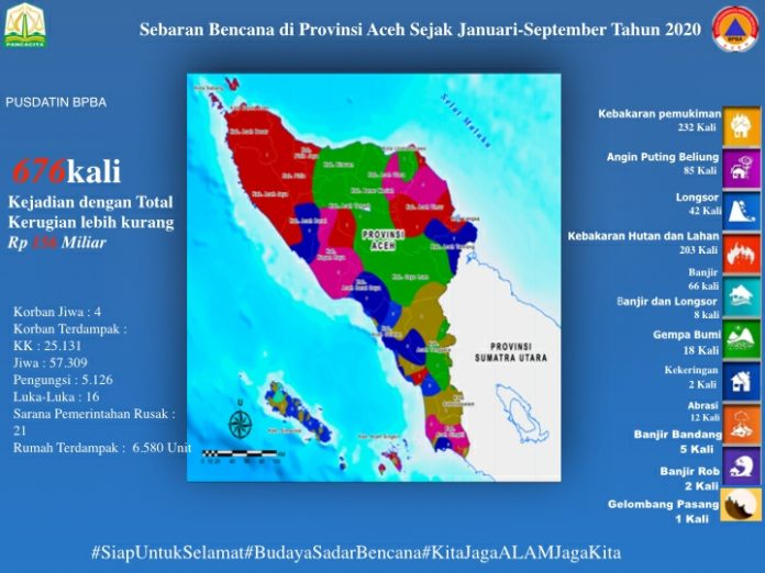 Analisaaceh.com, Banda Aceh | Badan Penanggulangan Bencana Aceh (BPBA) mencatat sebanyak 676 kejadian bencana terjadi di Aceh selama tahun 2020 yang terhitung sejak Januari hingga September.