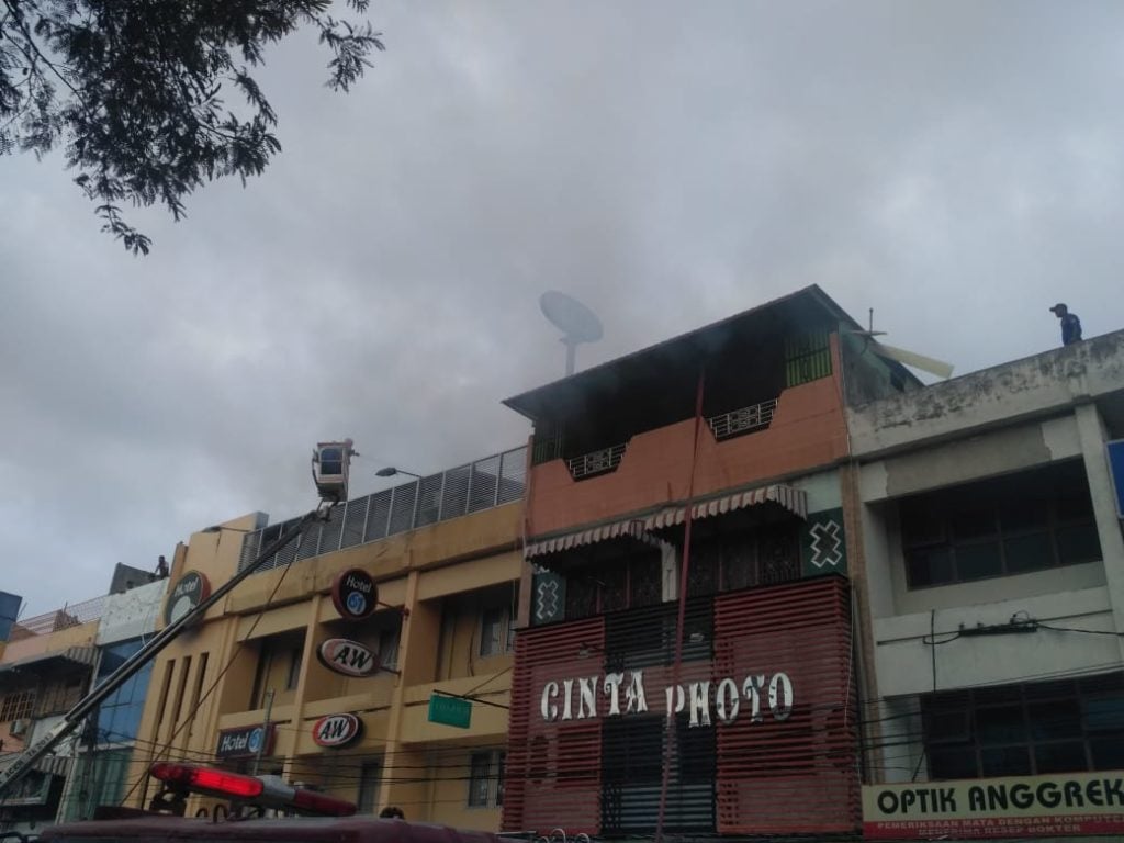 Bahkan kobaran api disertai asap hitam yang mengepul tinggi mulai merambah ke bangunan Cinta Photo yang berada di sebelahnya.