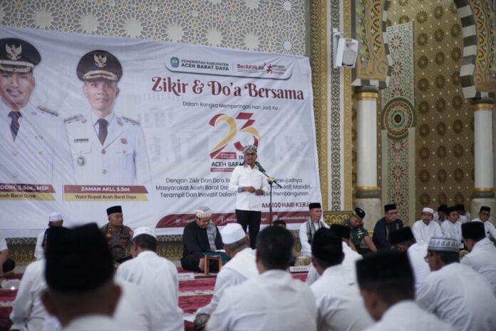 Analisaaceh.com, Blangpidie | Suasana haru menyelimuti Mesjid Agung Baitul Ghafur, Desa Seunaloh, Kecamatan Blangpidie, saat ribuan warga mengikuti zikir dan doa bersama memperingati Hari Ulang Tahun (HUT) Kabupaten Aceh Barat Daya (Abdya) ke-23, Kamis (10/4/2025).
