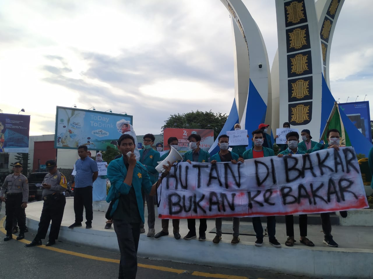Analisaaceh.com, Banda Aceh | Sejumlah mahasiwa Universitas Syiah Kuala (Unsyiah) menggelar aksi di bundaran Simpang Lima Kota Banda Aceh terkait kebakaran hutan dan lahan di Provinsi Riau, Selasa (17/9/2019).