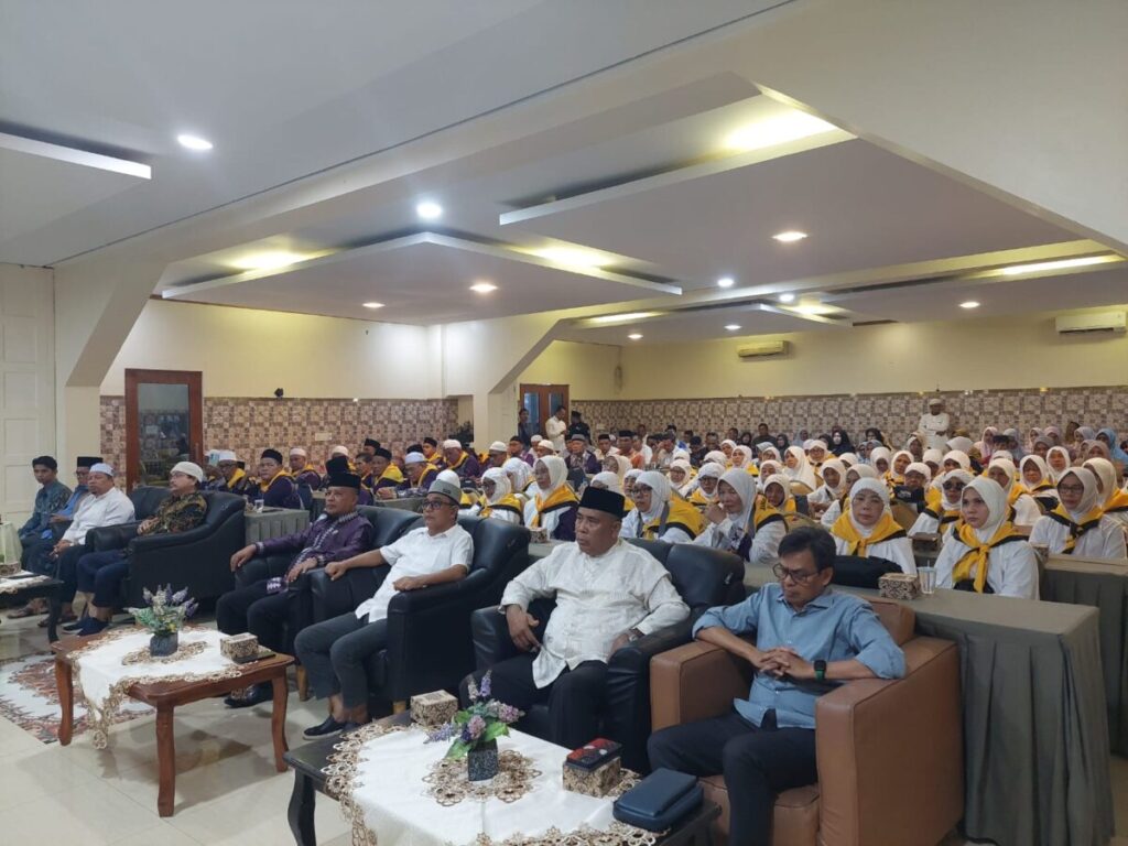 Penyambutan dan peusijuek jamaah calon haji asal Abdya oleh Ikatan Masyarakat Abdya (Ikamabdya) dan Himpunan Pelajar dan Mahasiswa Abdya (Hipelmabdya) Banda Aceh yang berlangsung di Hotel Hijrah Lambaro, Aceh Besar, Rabu (21/5/2025). Foto: Ist