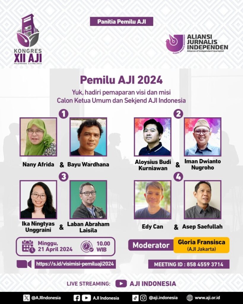 Pemilihan Ketum dan Sekjen AJI Indonesia tersebut merupakan bagian dari Kongres IIX AJI yang akan berlangsung di Palembang, Sumatera Selatan pada 3-5 Mei 2024 mendatang.
