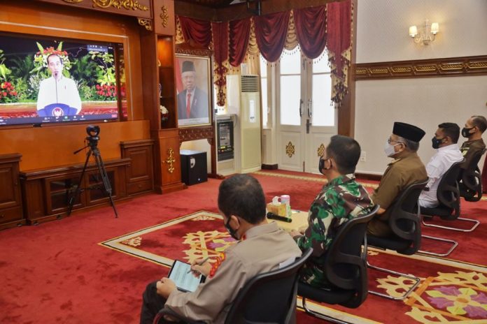 Analisaaceh.com, Banda Aceh | Gubernur Aceh Nova Iriansyah, bersama Wakil Ketua DPRA Safaruddin, Pangdam Iskandar Muda Mayjen TNI Achmad Marzuki, Wakapolda Aceh Raden Purwadi dan Asisten Perdata dan TUN Kejati Aceh A Jazuli, mendengarkan Pengarahan Presiden RI Joko Widodo, kepada Kepala Daerah se-Indonesia, di ruang tengah Meuligoe Gubernur Aceh, Rabu (28/4/2021).