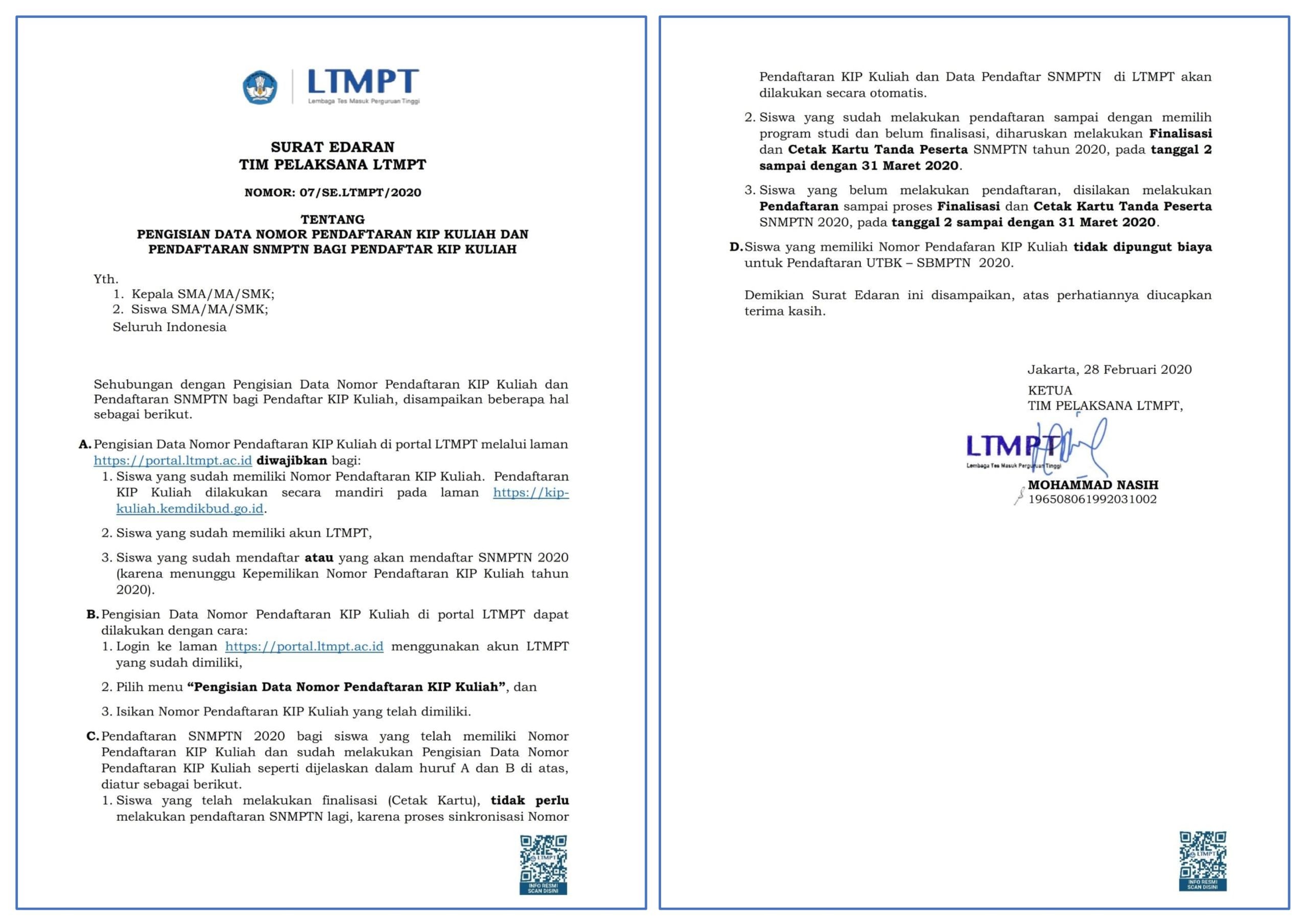 Pendaftaran Seleksi Nasional Masuk Perguruan Tinggi Negeri (SNMPTN) Tahun 2020 telah ditutup sejak 27 Februari 2020. Akan tetapi, pendaftaran diperpanjang khusus bagi siswa yang ingin mendapat dukungan Kartu Indonesia Pintar Kuliah ( KIP Kuliah).
