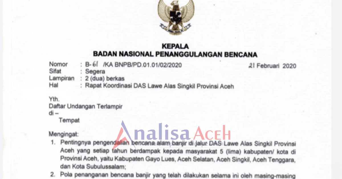 Rapat koordinasi tersebut akan digelar pada 27 Februari 2020 di gedung Graha BNPB lantai 15, jalan Pramuka Kav. 38, Jakarta Timur, sebagai bentuk upaya mitigasi dan kesiapsiagaan secara komprehensif dan terintegrasi dalam rangka penanggulan bencana banjir akibat luapan DAS yang melintasi Aceh Selatan, Gayo Lues, Aceh Singkil, Aceh Tenggara dan Kota Subulussalam.