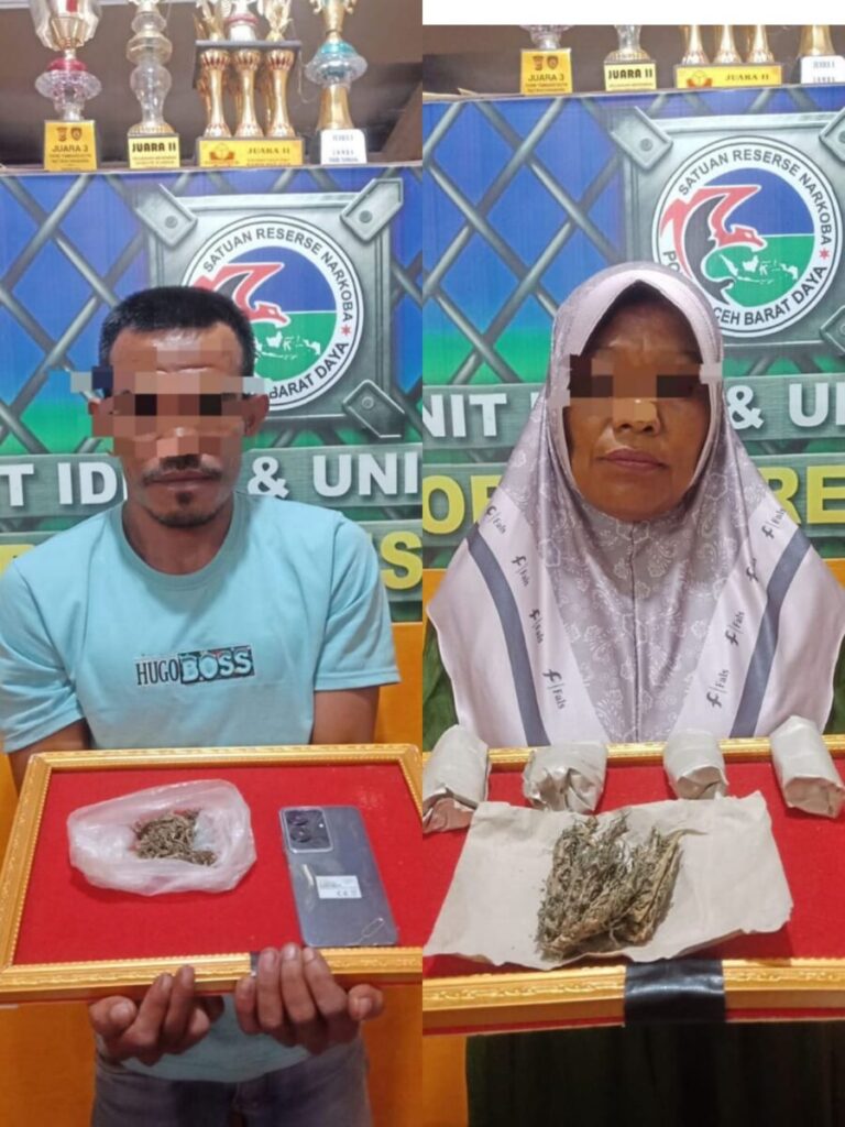 Analisaaceh.con, Blangpidie | Polisi menangkap seorang ibu rumah tangga berinisial RW (54), warga Gampong Alue Sungai Pinang, Kecamatan Jeumpa, Aceh Barat Daya (Abdya), yang diduga terlibat dalam penyalahgunaan narkotika jenis ganja. RW ditangkap bersama seorang sopir, SF (44), warga Gampong Tokoh II, Kecamatan Manggeng, di dua lokasi berbeda pada Senin (11/11/2024).