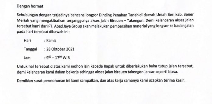 Kapolres Bener Meriah AKBP Agung Surya Prabowo, S.I.K melalui Kasat Lantas Polres Bener Meriah, Iptu Aiyub,S.E mengatakan, penutupan sementara waktu itu Berdasarkan surat permohonan dari PT. Abad Jaya Group.