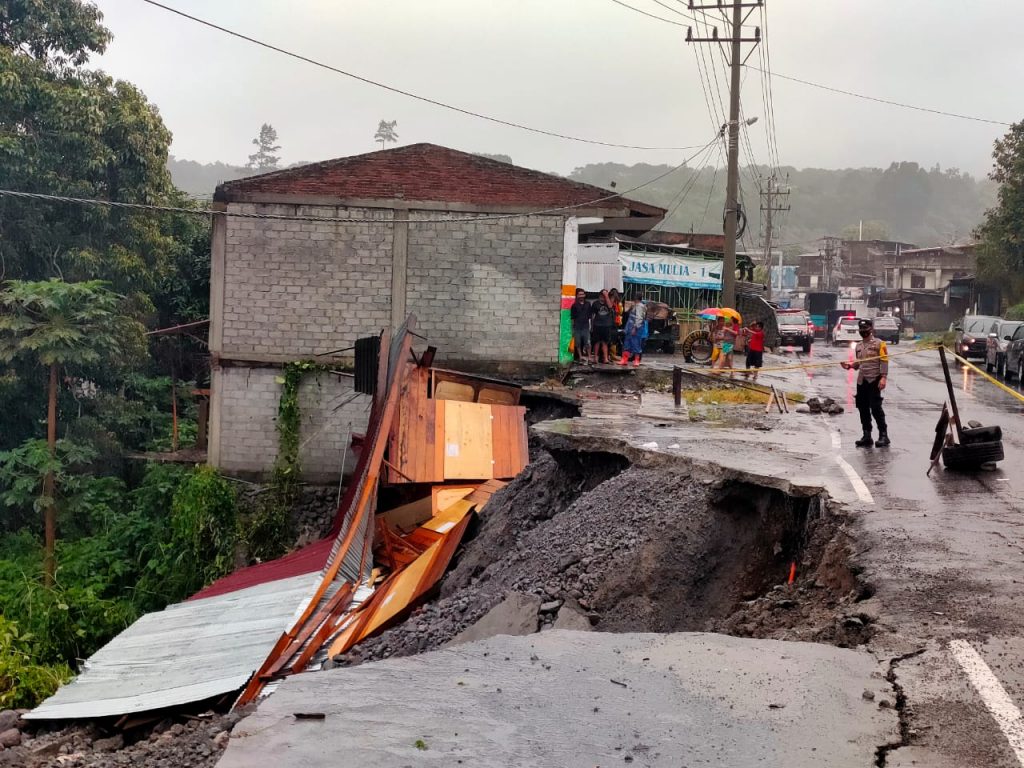 “Terkikisnya jalan tersebut juga mengakibatkan satu unit rumah toko milik warga, yang baru saja selesai di bangun ikut terbawa material longsor,” ujarnya.
