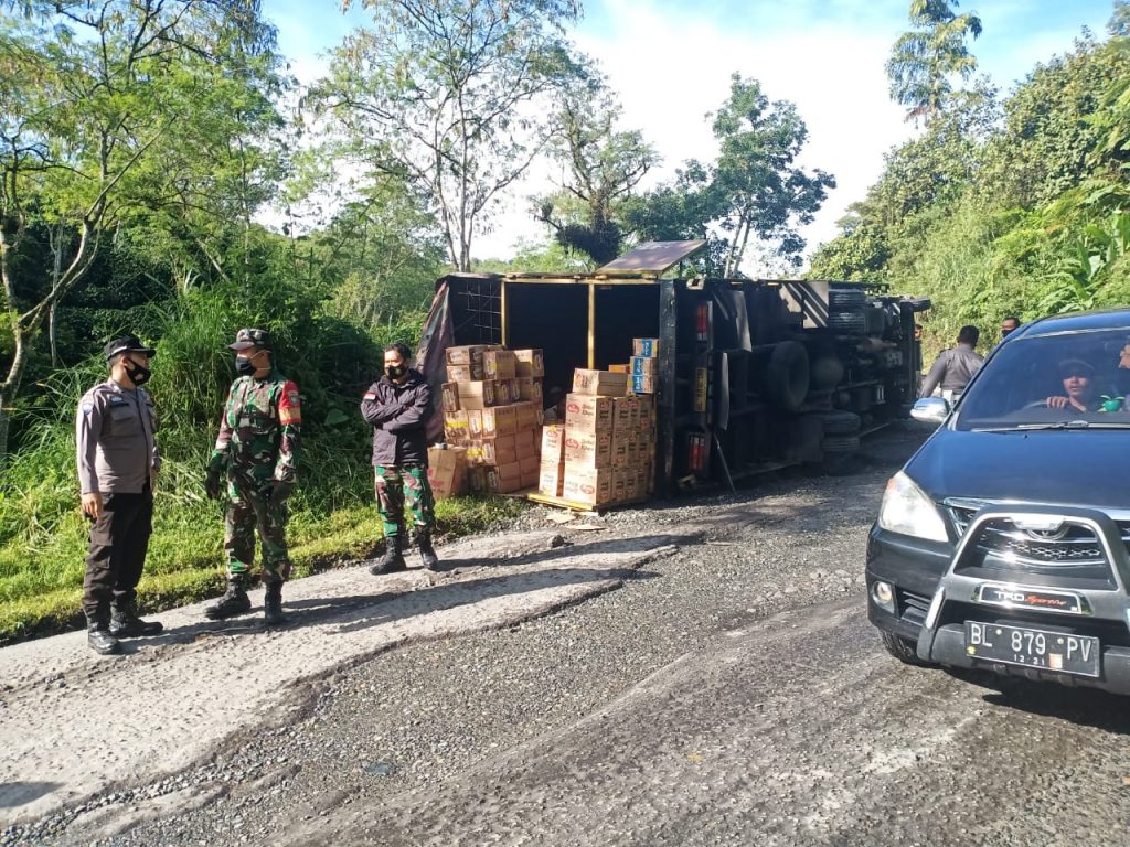 Analisaaceh.com, Redelong | Sebuah truk Colt Diesel bermuatan jajanan terguling di jalan Bireuen-Takengon, Kampung Gegerung, Kecamatan Wih Pesam, Kabupaten Bener Meriah, Jum’at (30/4/21).