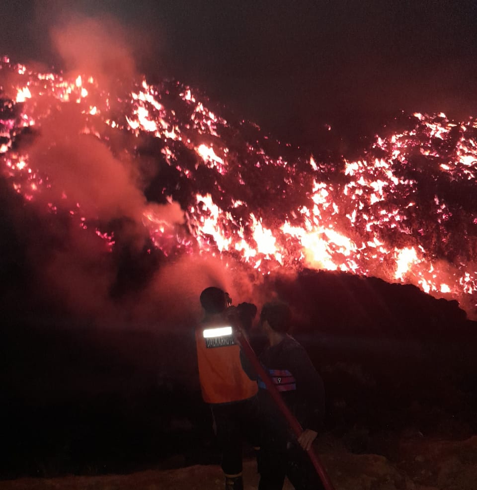 Petugas saat memadam kebakaran Limbah sawit kering (Jangkos) milik PT. Aceh Trumon Anugerah Kita (ATAK) yang berada di Gampong Kapaseusak, Kecamatan Trumon Timur, Kabupaten Aceh Selatan. (Foto: Ist)