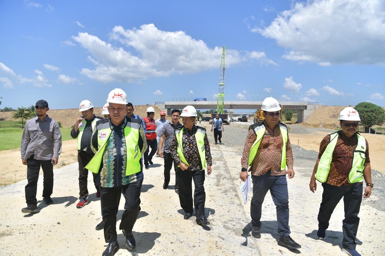 Pembangunan jalan bebas hambatan tersebut menunjukkan progres yang menggembirakan. Dari beberapa lokasi yang dituju Sekda bersama tim, pihak Hutama Karya selalu pemegang mandat pengembangan jalan tol Trans Sumatera menjelaskan lokasi beberapa titik pintu keluar masuk tol.