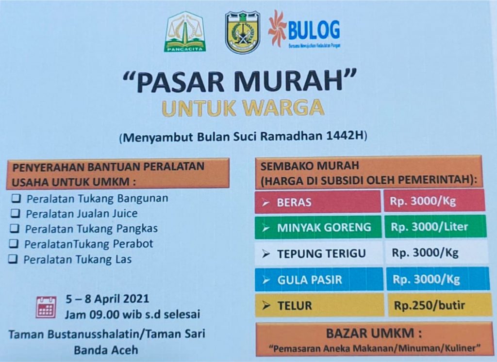 Pasar Murah tersebut rencana akan diselenggarakan dari tanggal 5-8 April mendatang di Taman Bustanussalatin/Taman Sari Banda Aceh.