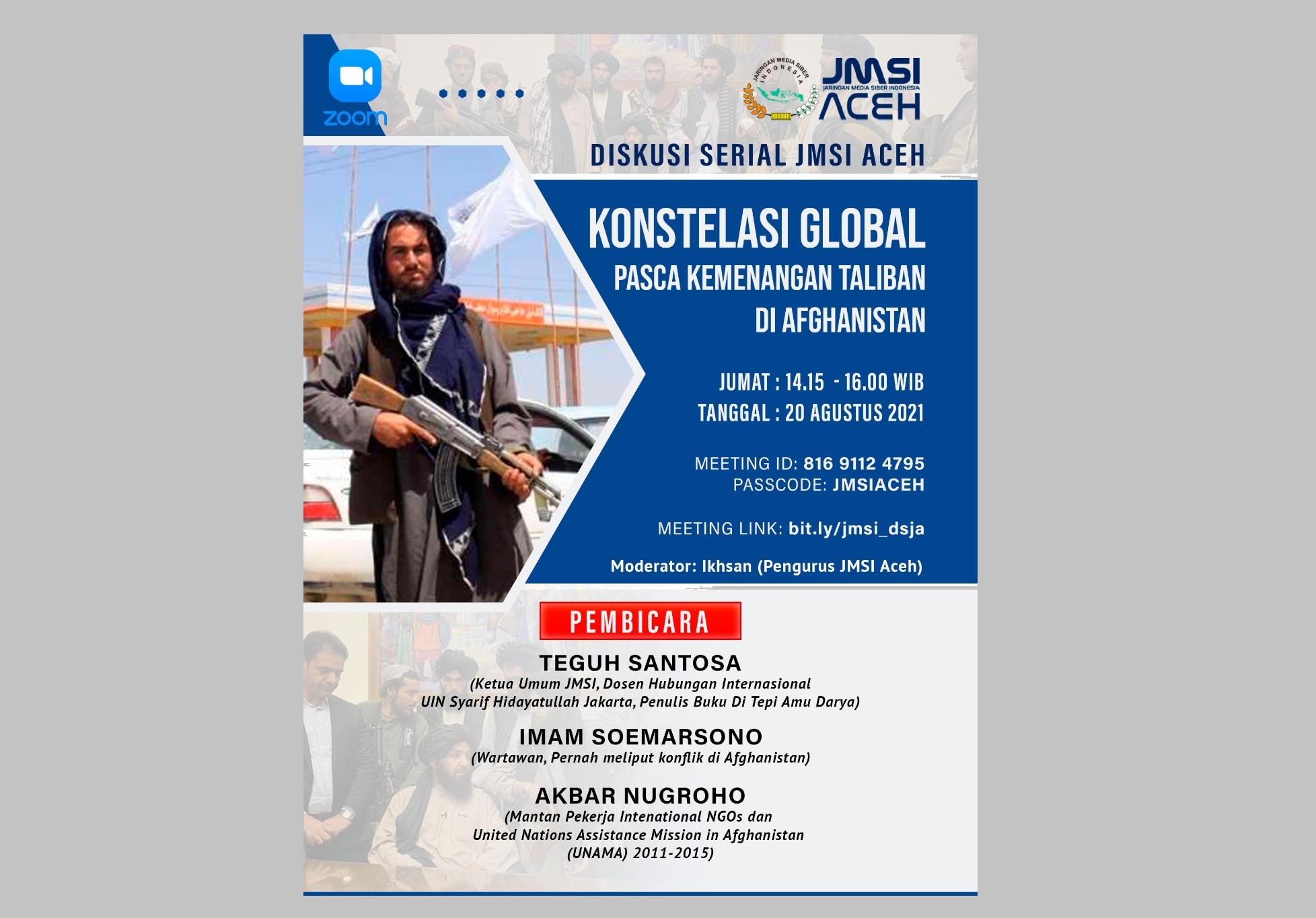 Analisaaceh.com, Banda Aceh | Jaringan Media Siber Indonesia (JMSI) Aceh, akan melakukan diskusi virtual pasca kemenangan kelompok Taliban di Afganistan. Kegiatan itu, menghadirkan tiga orang narasumber yang memiliki pengalaman dan pandangan soal kondisi negeri tersebut, yakni, Teguh Santosa, CEO RMOL.ID, yang juga penulis buku di Tepi Amu Darya.