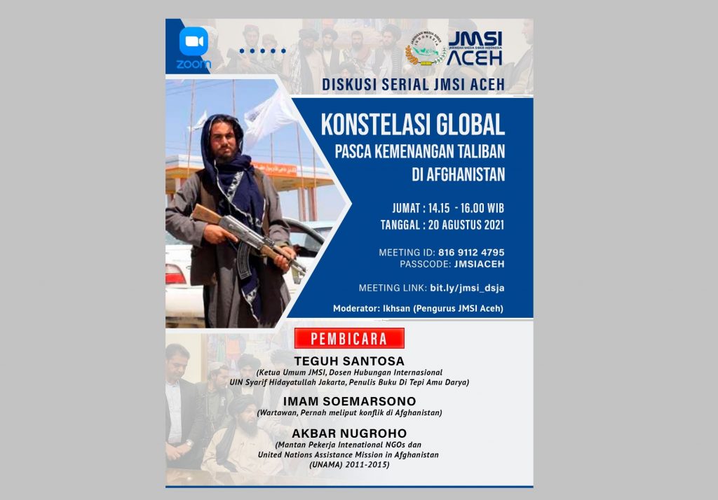 Sekretaris JMSI Aceh, Akhiruddin Mahjuddin, dalam keterangan tertulisnya, Kamis (19/8/2021), menerangkan, kegiatan diskusi menyangkut topik Taliban di Afganistan, didasarkan pada isu global yang saat ini menjadi sentrum dunia, pasca kemenangan besar yang diraih kelompok Taliban di negeri mayoritas etnik Pasthun tersebut.