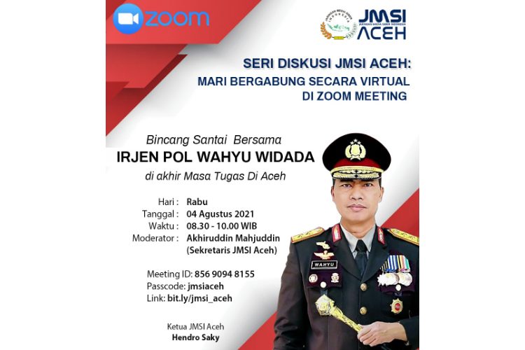 “Diskusi itu, nantinya akan dipandu oleh Sekretaris JMSI Aceh, Akhiruddin Mahjuddin, dan masyarakat yang hendak bergabung untuk menyampaikan ucapan terimakasih kepada Kapolda Aceh, dapat bergabung melalui zoom,” demikian Hendro Saky menjelaskan.