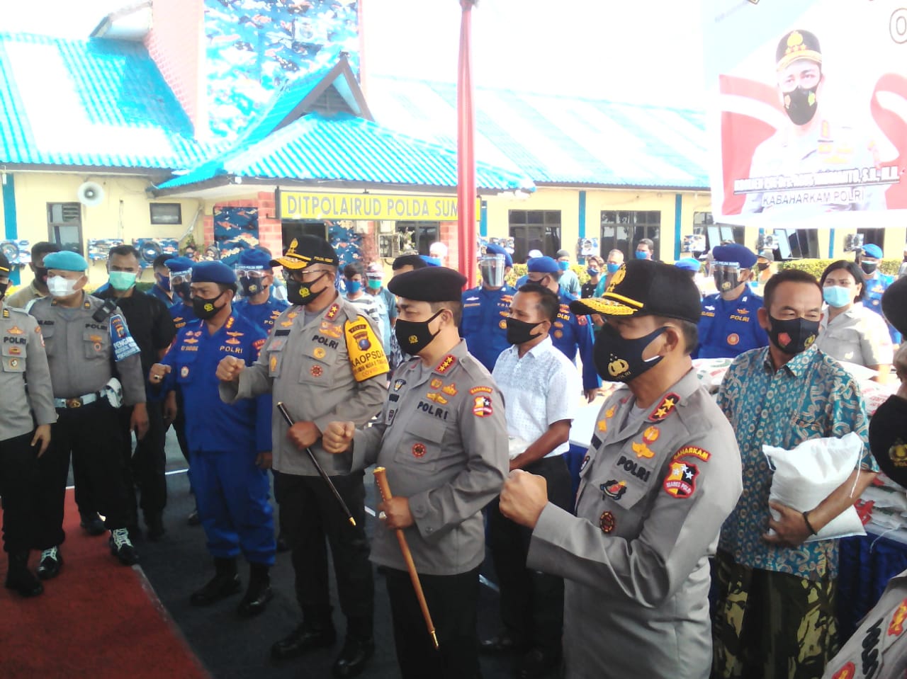 Setelah melakukan pengecekan kapal poliklinik terapung tersebut, Komjen Pol Agus turut membagikan paket sambako kepada masyarakat yang kurang mampu tengah pandemi Covid-19.