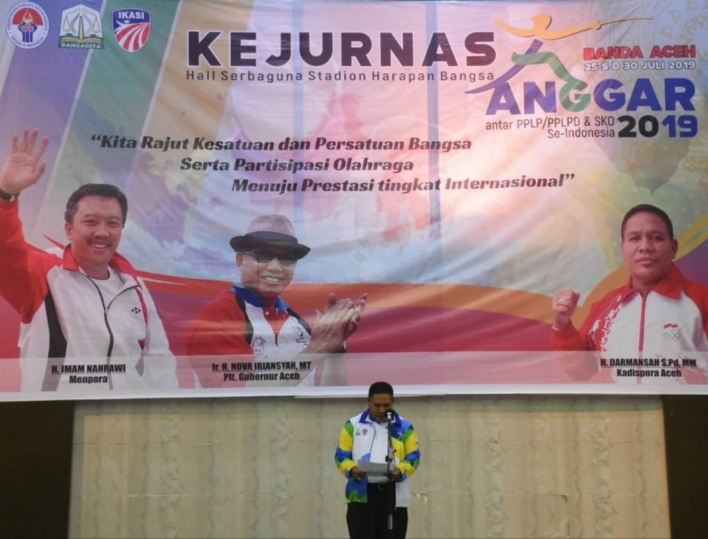 ANALISAACEH.com | Banda Aceh – Plt. Guberbernur Aceh yang diwakili oleh Kepala Dinas Pemuda dan Olahraga Aceh H. Darmansah, S.Pd., MM buka Kejuaraan Nasional (Kejurnas) PPLP/PPLPD dan SKO Se- Indonesia di Hall serbaguna Stadion Harapan Bangsa Lhong Raya Banda Aceh, Jumat (26/7/2019) malam.