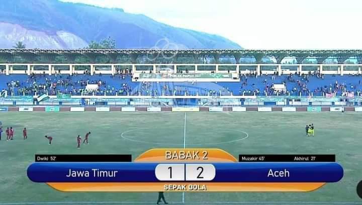 Analisaaceh.com | Tim sepak bola Aceh berhasil melaju ke babak final Pekan Olahraga Nasional (PON) XX 2021 usai menundukkan Jawa Timur (Jatim) dengan skor 2-1 di Stadion Barbanas Youwe, Kabupaten Jayapura, Selasa (12/10/2021).