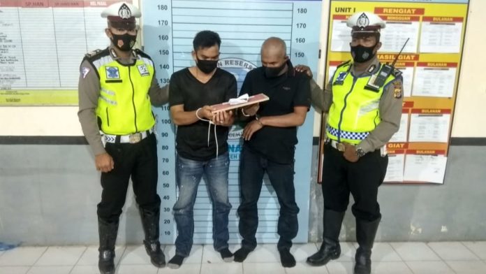 Analisaaceh.com, Lhoksukon – Personel Satuan lalu lintas Polres Aceh Utara mengamankan dua pria yakni pengendara dan penumpang sepmor Vario saat melakukan pengaturan lalu lintas sore di perempatan Kota Lhoksukon, Kamis (11/2/2021), mereka ditangkap sebab kedapatan membawa sebungkus daun ganja.