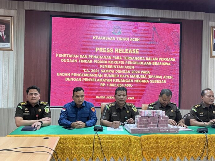 Analisaaceh.com, Banda Aceh | Kepala Dinas Perpustakaan dan Kearsipan Aceh berinisial S ditetapkan sebagai tersangka dalam kasus dugaan korupsi pengelolaan beasiswa Pemerintah Aceh tahun 2021–2024. Kejaksaan Tinggi Aceh menyebut, potensi kerugian negara dalam perkara ini mencapai Rp14,07 miliar.