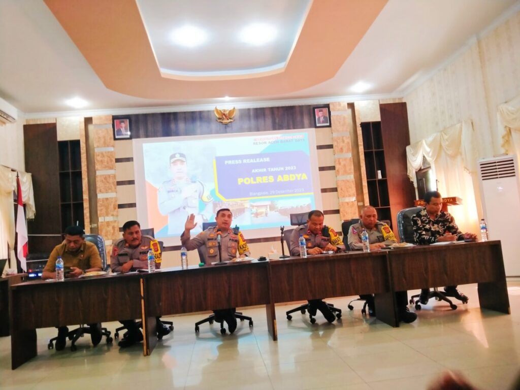 Hal itu disampaikan oleh Kapolres Abdya, AKBP Dhani Catra Nugraha didampingi Waka Polres, Kompol Asyhari Hendri, Kasatreskrim, AKP Erjan Dasmi dan Kasatreskoba, Iptu Hengki Harianto serta Kabag Ops, AKP Basridar pada konferensi pers akhir tahun, di gedung Aula Mapolres setempat, Jum’at (29/12/2023).