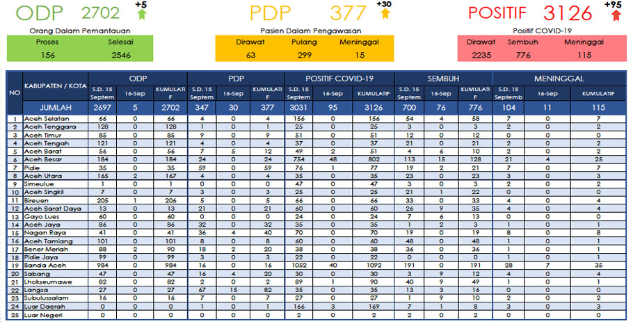 Berdasarkan data terbaru yang dilansir dari laman website Dinas Kesehatan Aceh, penambahan 95 orang tersebut berasal dari berbagai kabupaten/kota berbeda, yaitu dari Banda Aceh 40 kasus, Aceh Besar 48 kasus, Pidie 1 kasus, Lhokseumawe 1 kasus dan dari luar daerah 3 kasus.