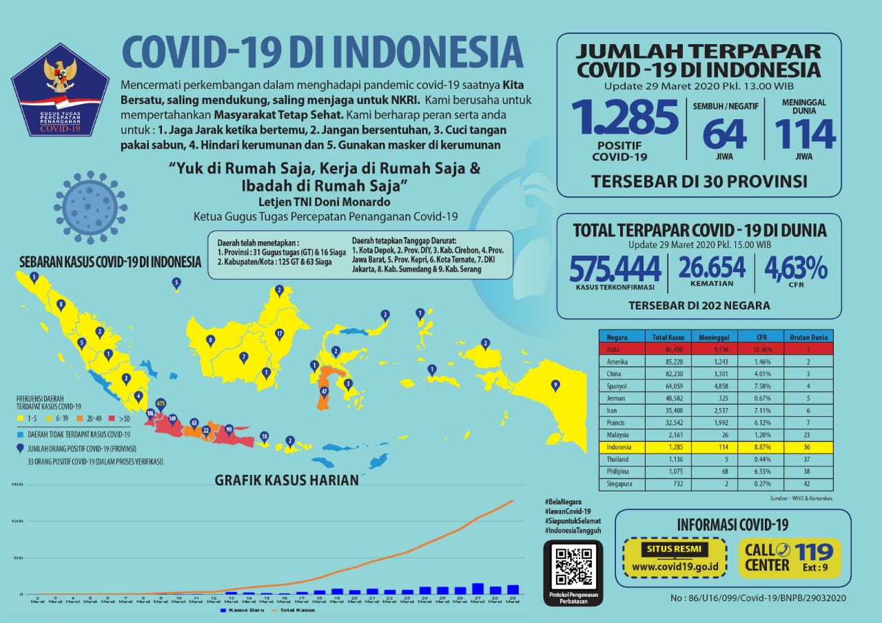Analisaaceh.com, Jakarta | Pemerintah Indonesia melalui Gugus Tugas Percepatan Penanganan COVID-19 mencatat ada penambahan kasus positif Covid-19 di Indonesia sebanyak 130 sehingga menjadi 1.285 kasus, kemudian yang sembuh bertambah 5 sehingga total menjadi 64 orang dan tambahan meninggal ada 12 sehingga menjadi 114 sebagaimana menurut data per Minggu (29/3).