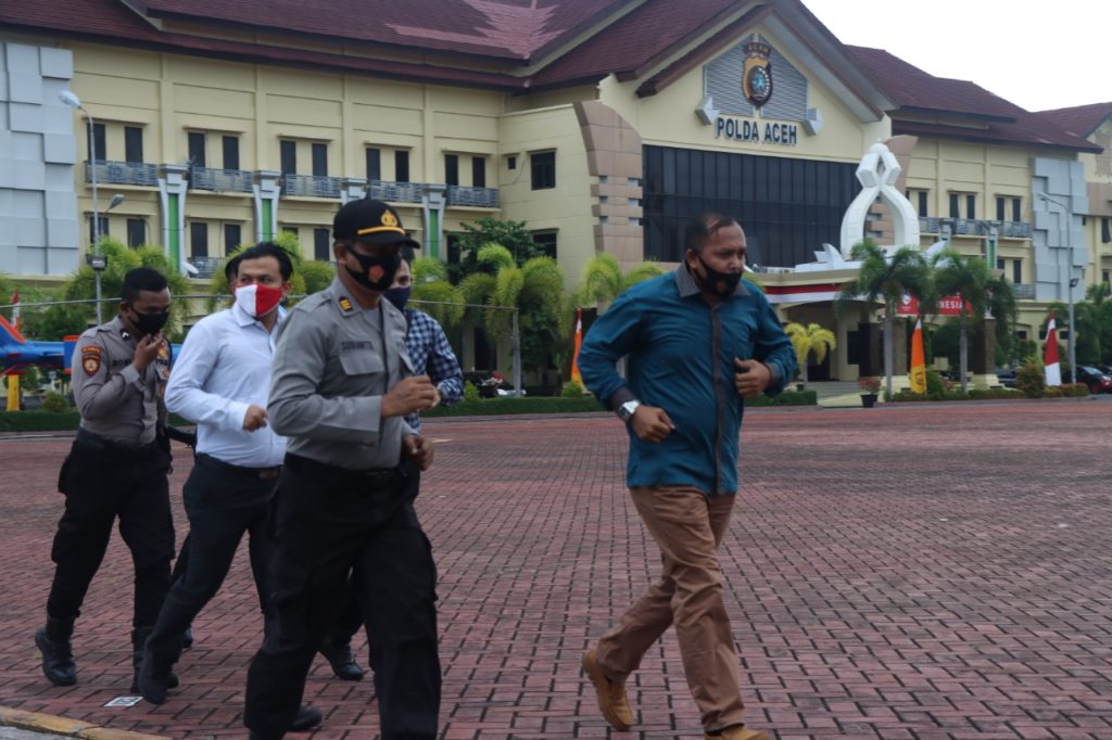 Analisaaceh.com, Banda Aceh | Sebanyak 8 personel Polda Aceh yang tidak memakai masker saat memasuki Mapolda Aceh, Selasa (25/8/2020) pagi diberi sanksi lari keliling lapangan apel dan korve di lingkungan Masjid Babuttaqwa, Mapolda Aceh.