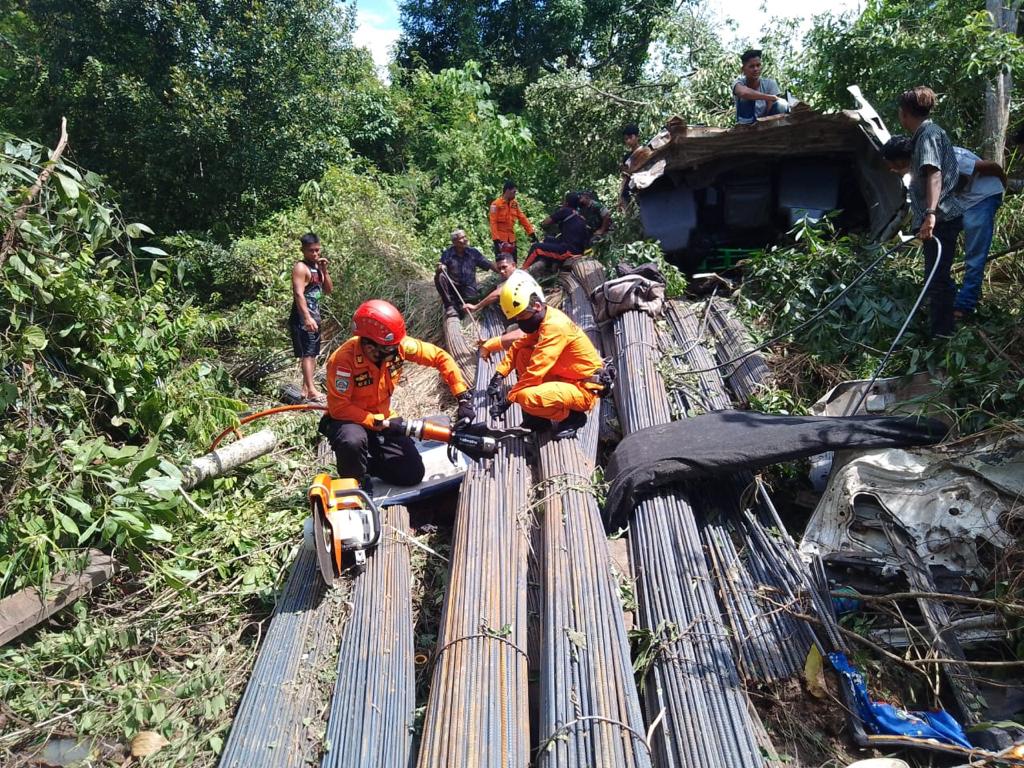 Korban atas nama Betmen Gultom (47) ini dievakuasi oleh Tim SAR selama lima jam dari timbunan besi muatan truk tersebut.