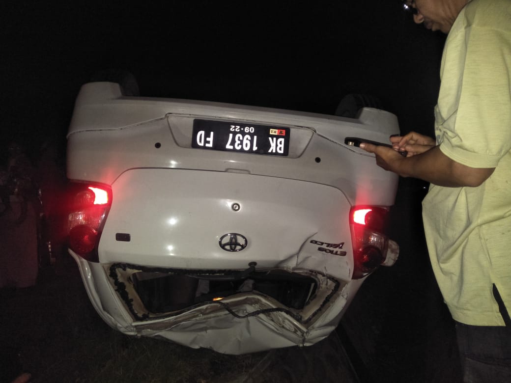 “Sesampainya di tikungan SMP N 4 Pulo Rungkom, mobil tersebut keluar jalur dan oleng ke kiri, dikarenakan supir terkejut dengan tikungan tersebut supir membanting setir ke arah kanan dan menyebabkan mobil masuk ke dalam parit dan selajutnya mobil terbalik,” ujarnya.