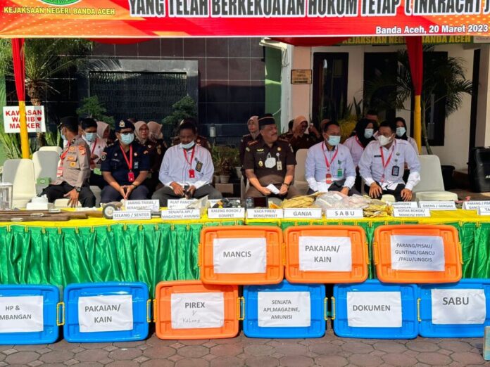 Analisaaceh.com, Banda Aceh | Kejaksaan Negeri (Kejari) Banda Aceh memusnahkan barang bukti sitaan yang telah berkekuatan hukum tetap selama kurun waktu bulan November 2022 sampai Maret 2023 di Kantor Kejaksaan setempat pada Senin (20/3/2023).