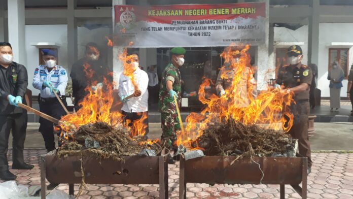 Analisaaceh.com, Redelong | Sebanyak 147 Kg narkotika jenis ganja dimusnahkan dengan cara dibakar oleh Kejaksaan Negeri (Kejari) Bener Meriah pada Rabu (23/2/2022).