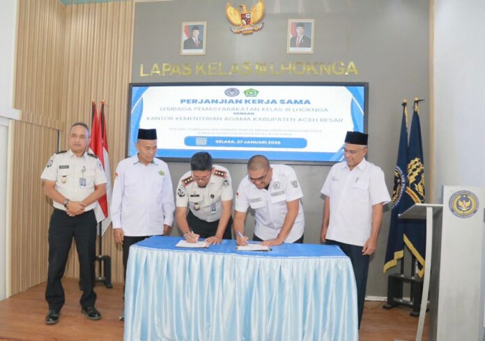 Analisaaceh.com, Aceh Besar | Kantor Kementerian Agama (Kemenag) Kabupaten Aceh Besar kembali menandatangani perjanjian kerja sama dengan Lembaga Pemasyarakatan (Lapas) Kelas III Lhoknga dalam program pembinaan keagamaan bagi warga binaan pemasyarakatan (WBP), Selasa (27/1/2026).
