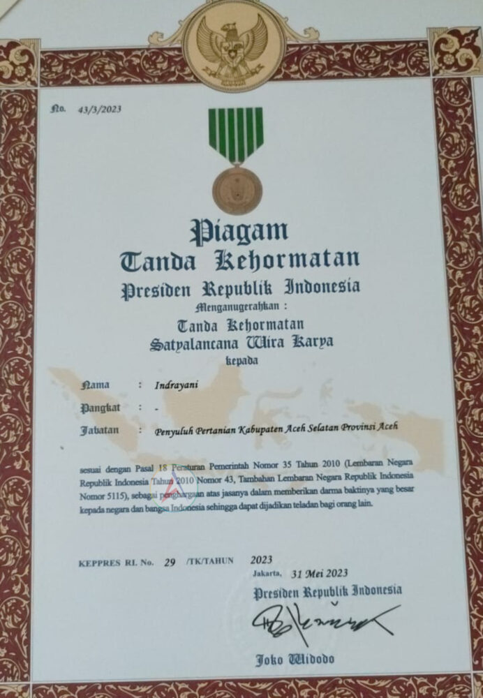 “Kami mengucapkan terima kasih kepada Presiden RI, Joko Widodo atas penghargaan tanda kehormatan Satyalancana Wira Karya yang telah dianugerakan kepada kami, semoga ini menjadi semangat untuk kami terus berkarya memajukan bidang pertanian dan khusus untuk para petani di Aceh Selatan,” pungkas Indrayani.